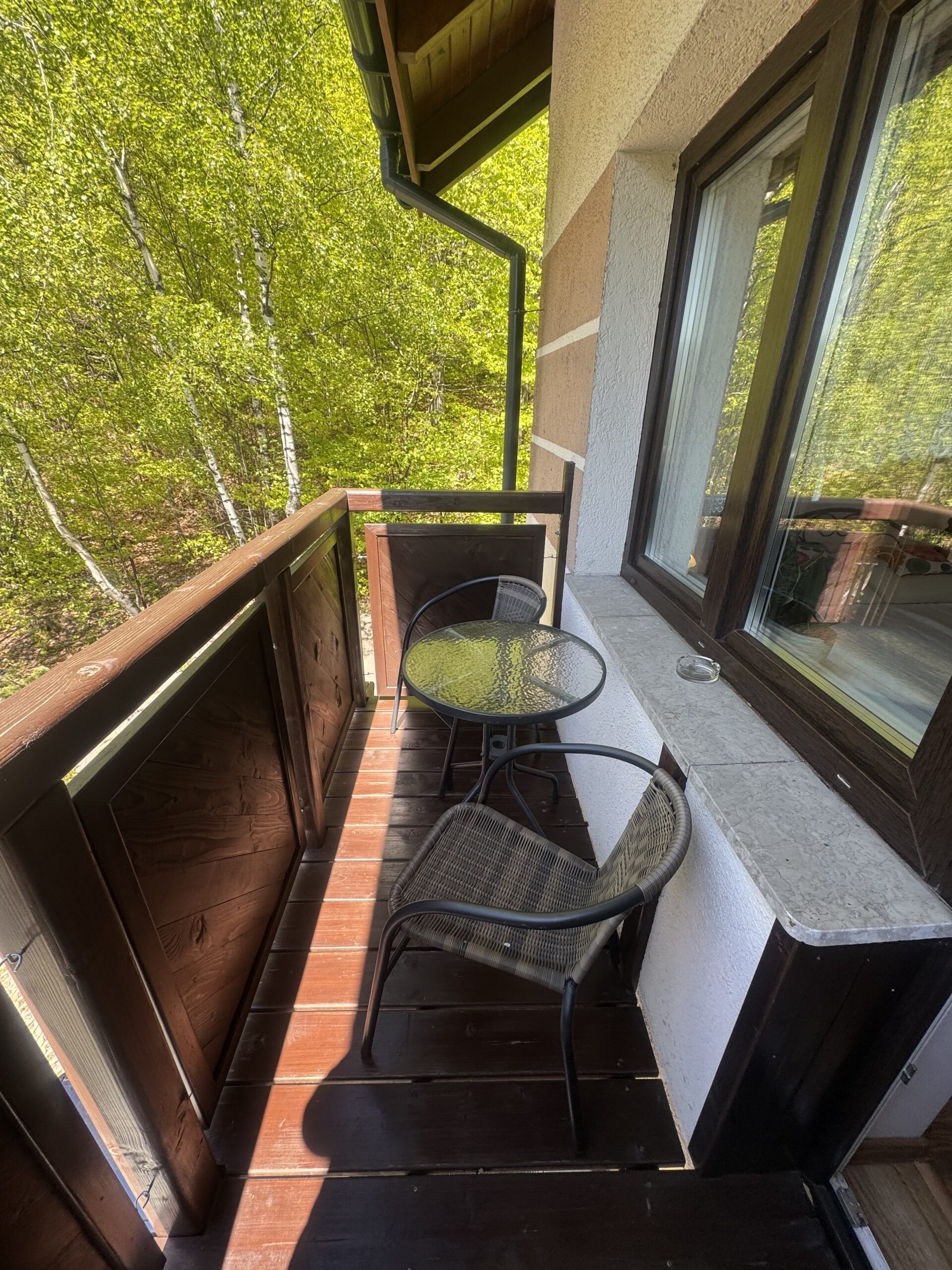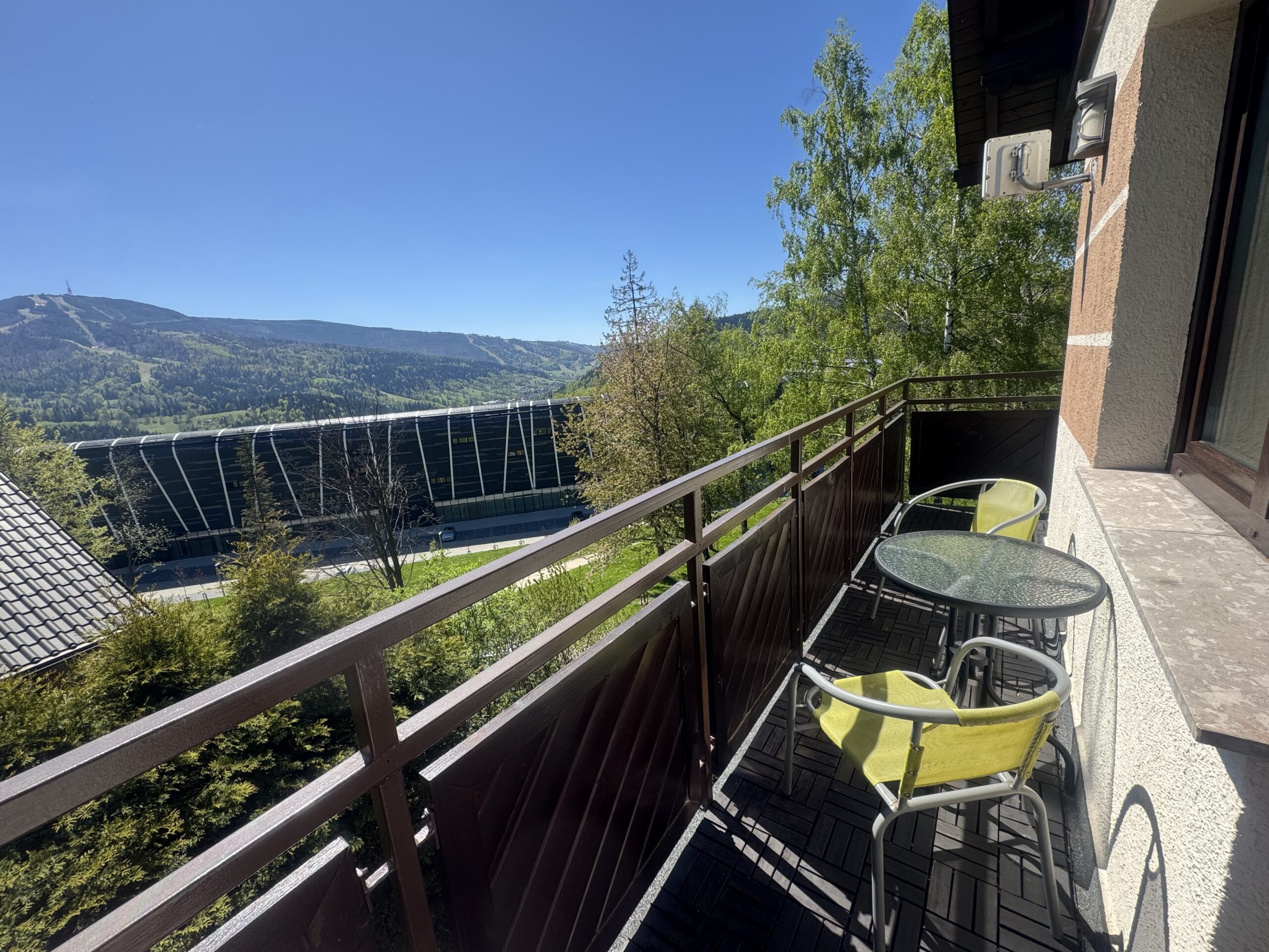 Apartament znajduje się na III piętrze i składa się z salonu, wydzielonej części sypialnej oraz łazienki. Salon posiada duże okno oraz balkon, z którego rozpościera się fantastyczny widok na Skrzyczne oraz inne okoliczne szczyty.