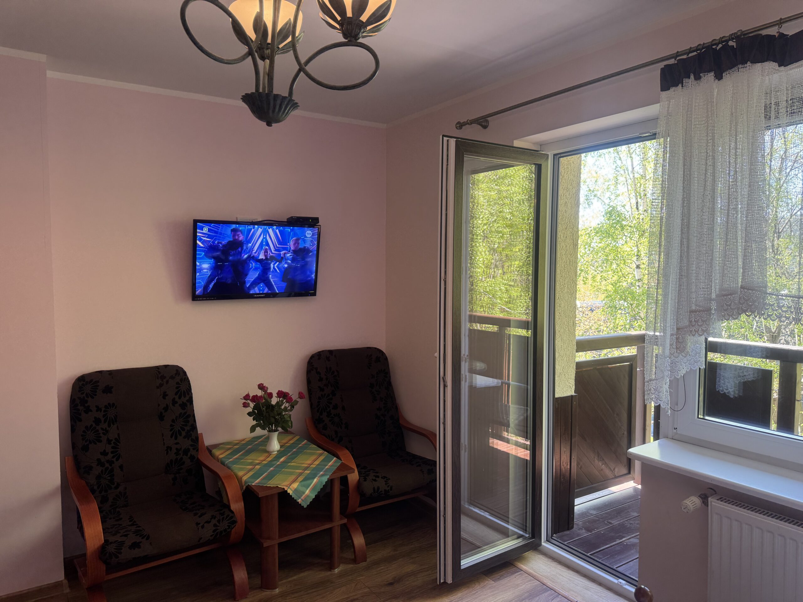 dwa odbiorniki TV: jeden 32 calowy w sypialni, drugi 40 calowy w salonie (pełne spektrum kanałów telewizji naziemnej)bezprzewodowy dostęp do internetulodówkaczajnik bezprzewodowyzestaw balkonowy (2 krzesła + stolik)suszarka do włosówpościelręcznikiW łazience zainstalowano kabinę prysznicową.