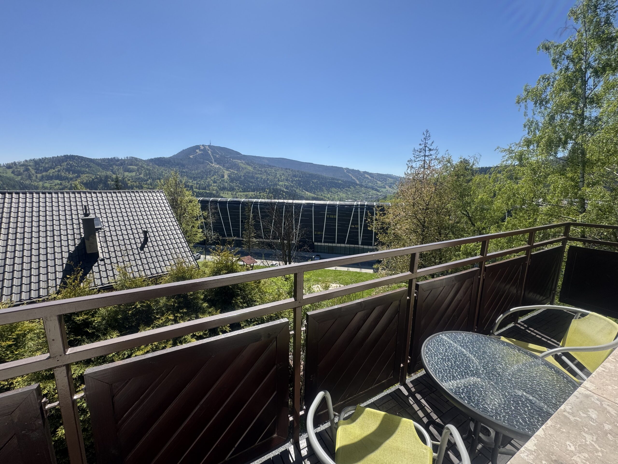 Apartament znajduje się na II piętrze i składa się z salonu, sypialni oraz łazienki. Salon posiada wyjście na duży, narożny balkon, z którego rozpościera się fantastyczny widok na Skrzyczne oraz inne okoliczne szczyty.