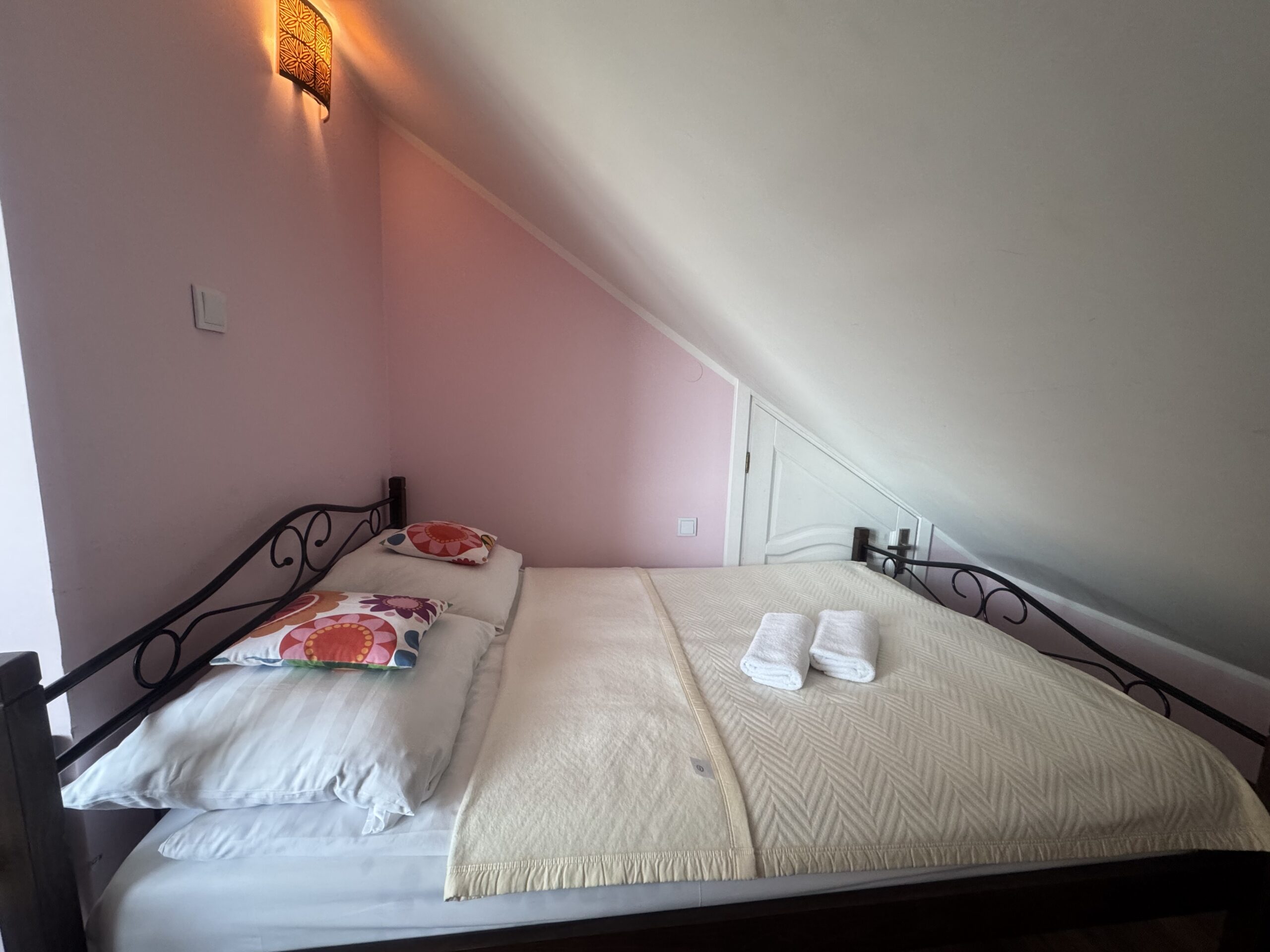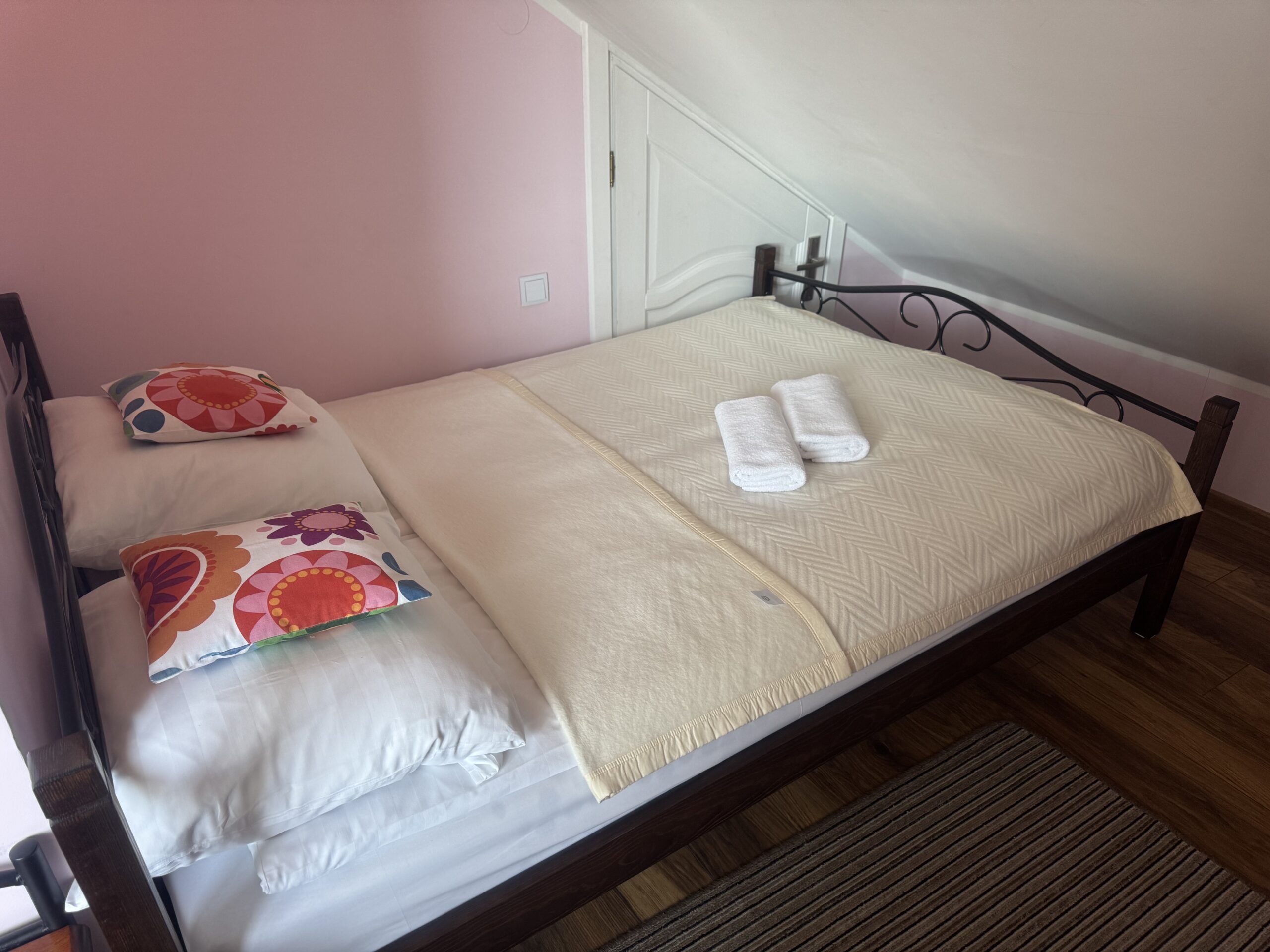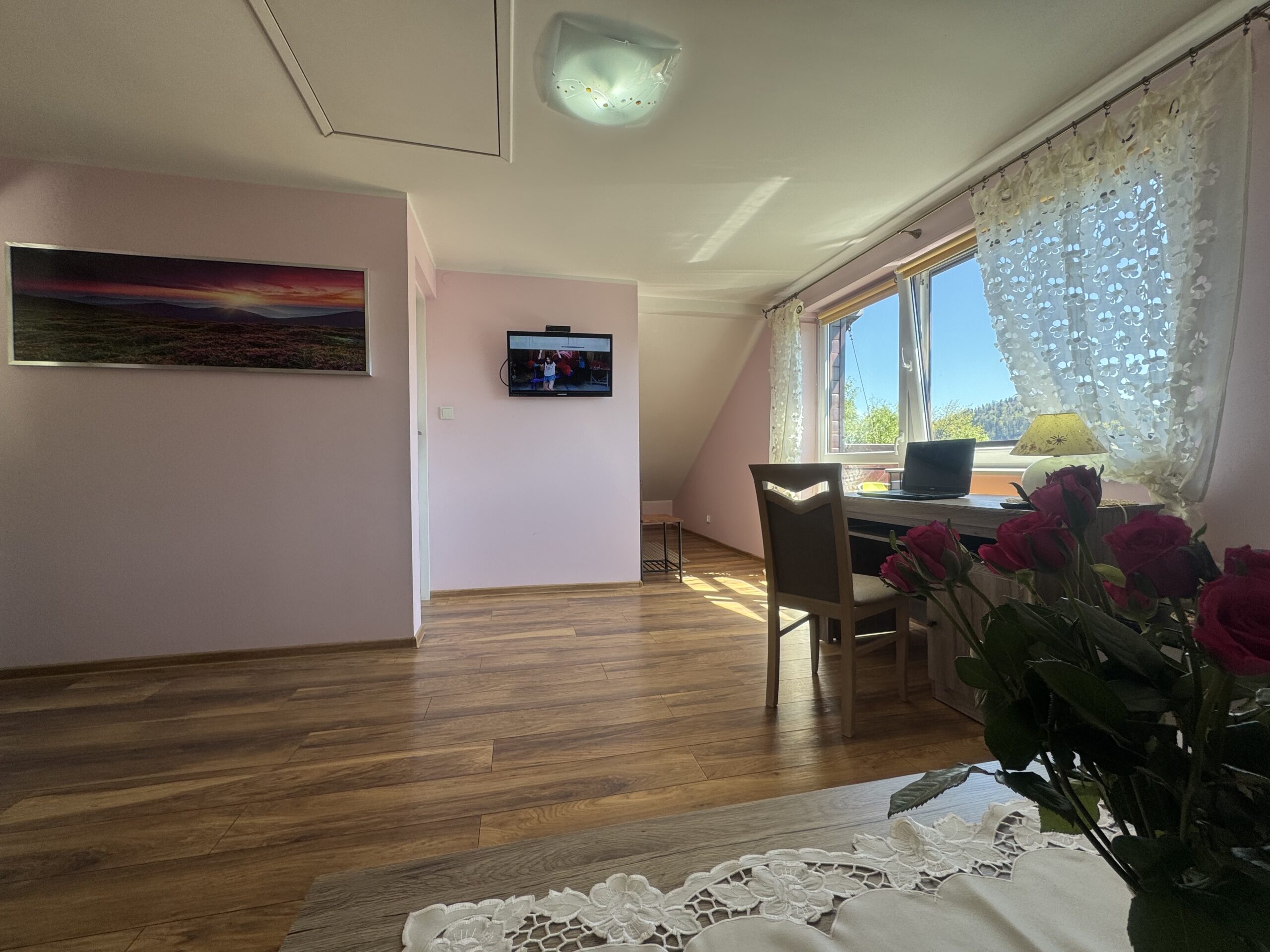 Pokój znajduje się na II piętrze, posiada przynależną łazienkę oraz balkon, z którego rozpościera się piękny widok na Skrzyczne. Pokój wyposażony jest w: