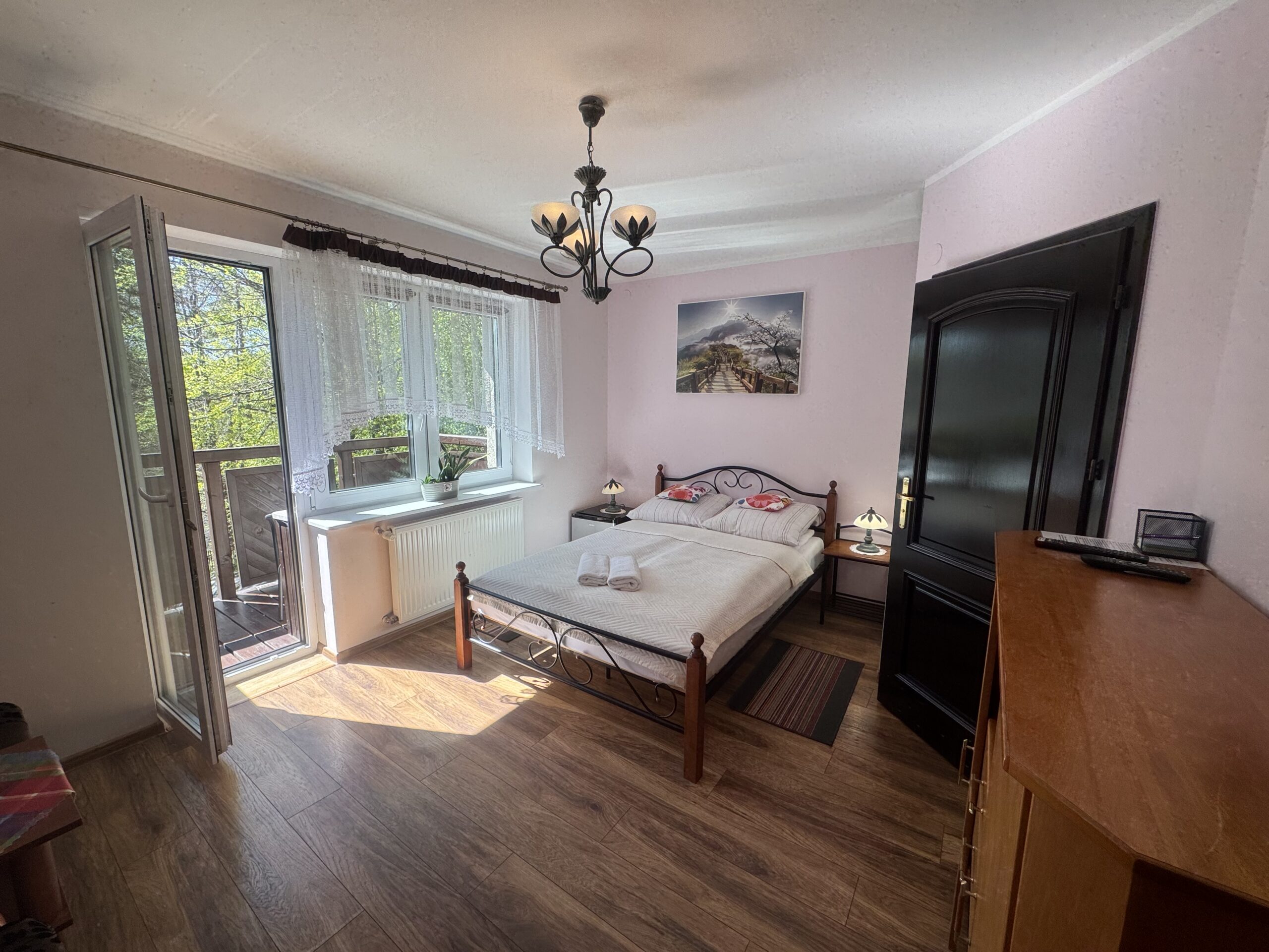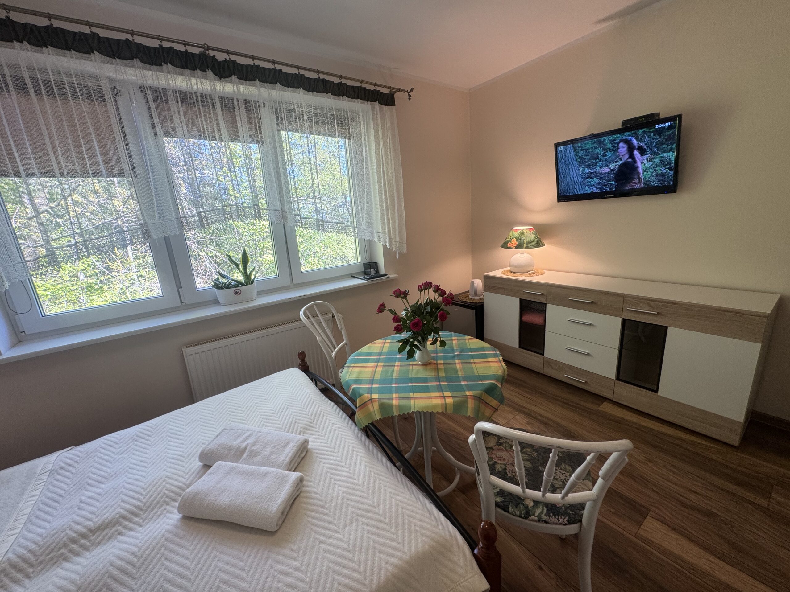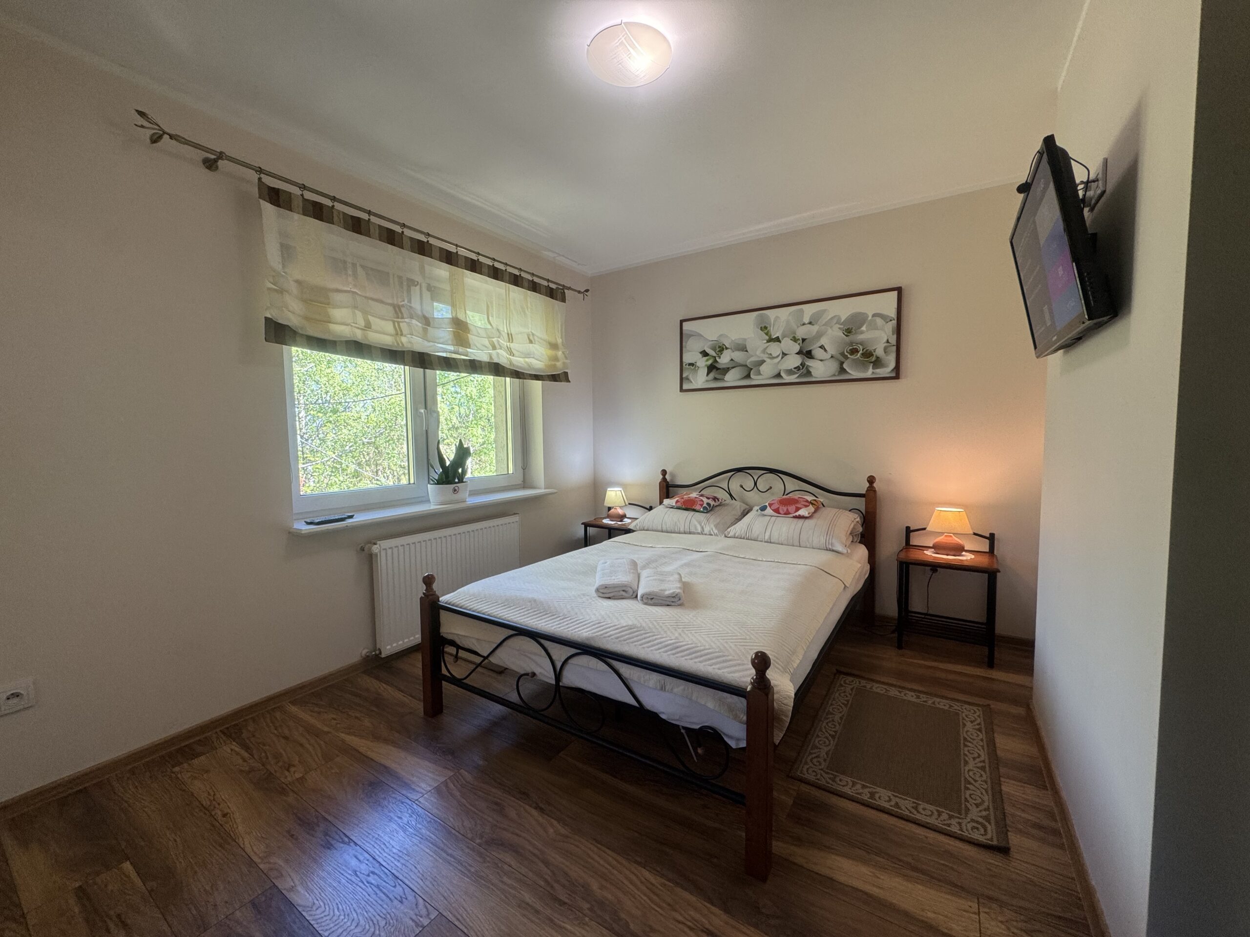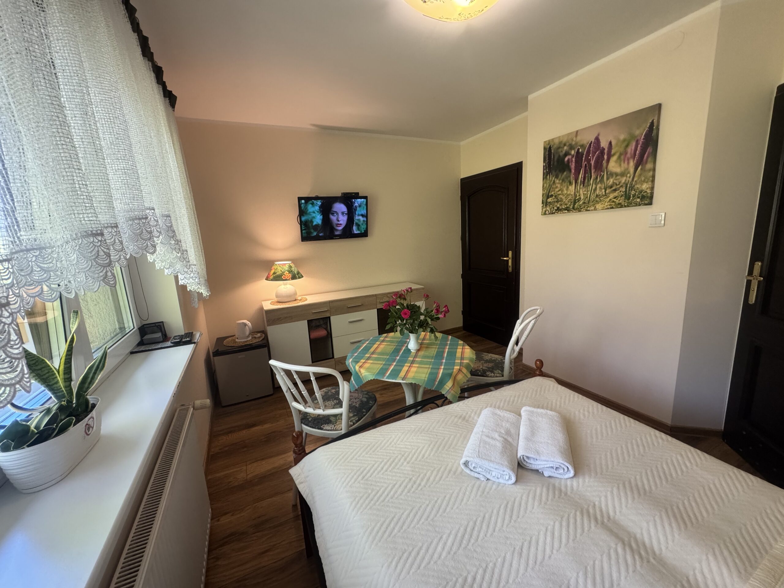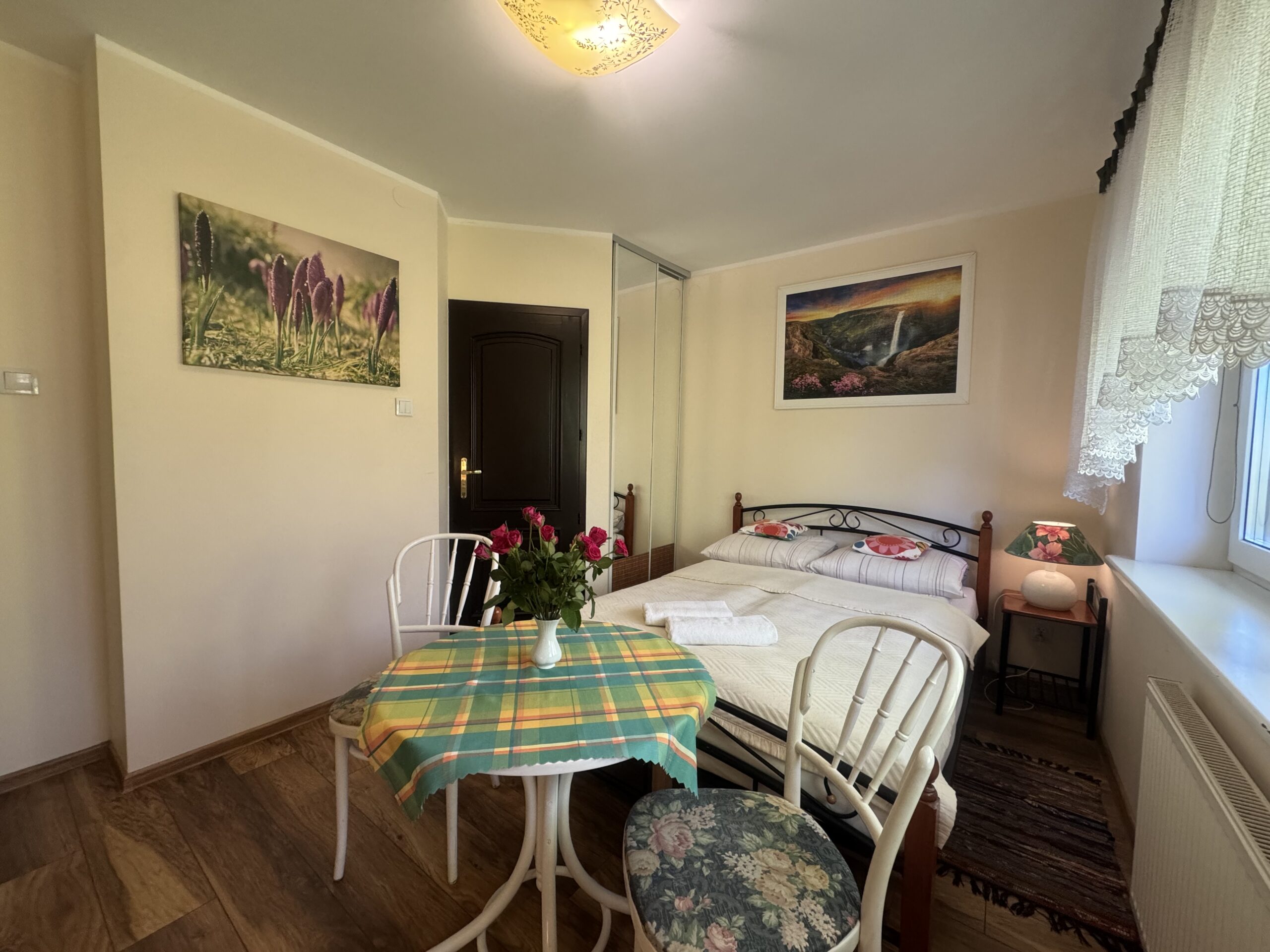 łóżko małżeńskie (double bed),stolik nocny z lampkąstolik oraz 2 krzesłakomodęszafę zabudowanąW pokoju do dyspozycji Państwa pozostają: