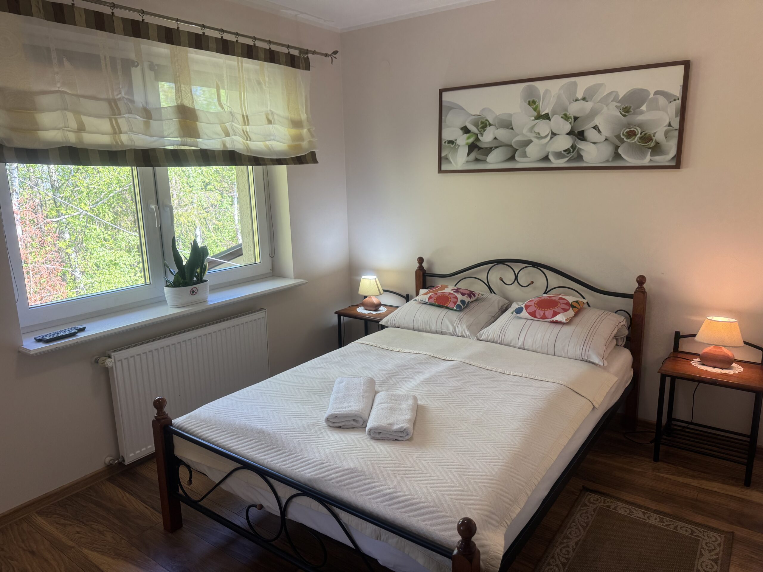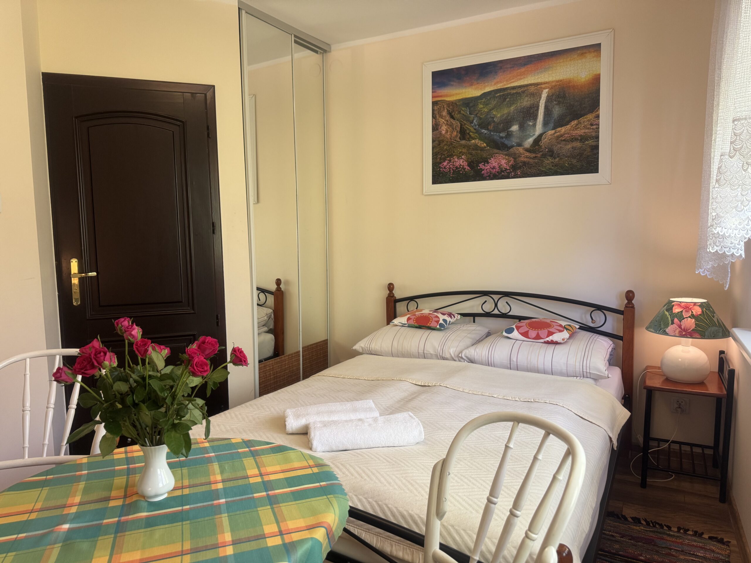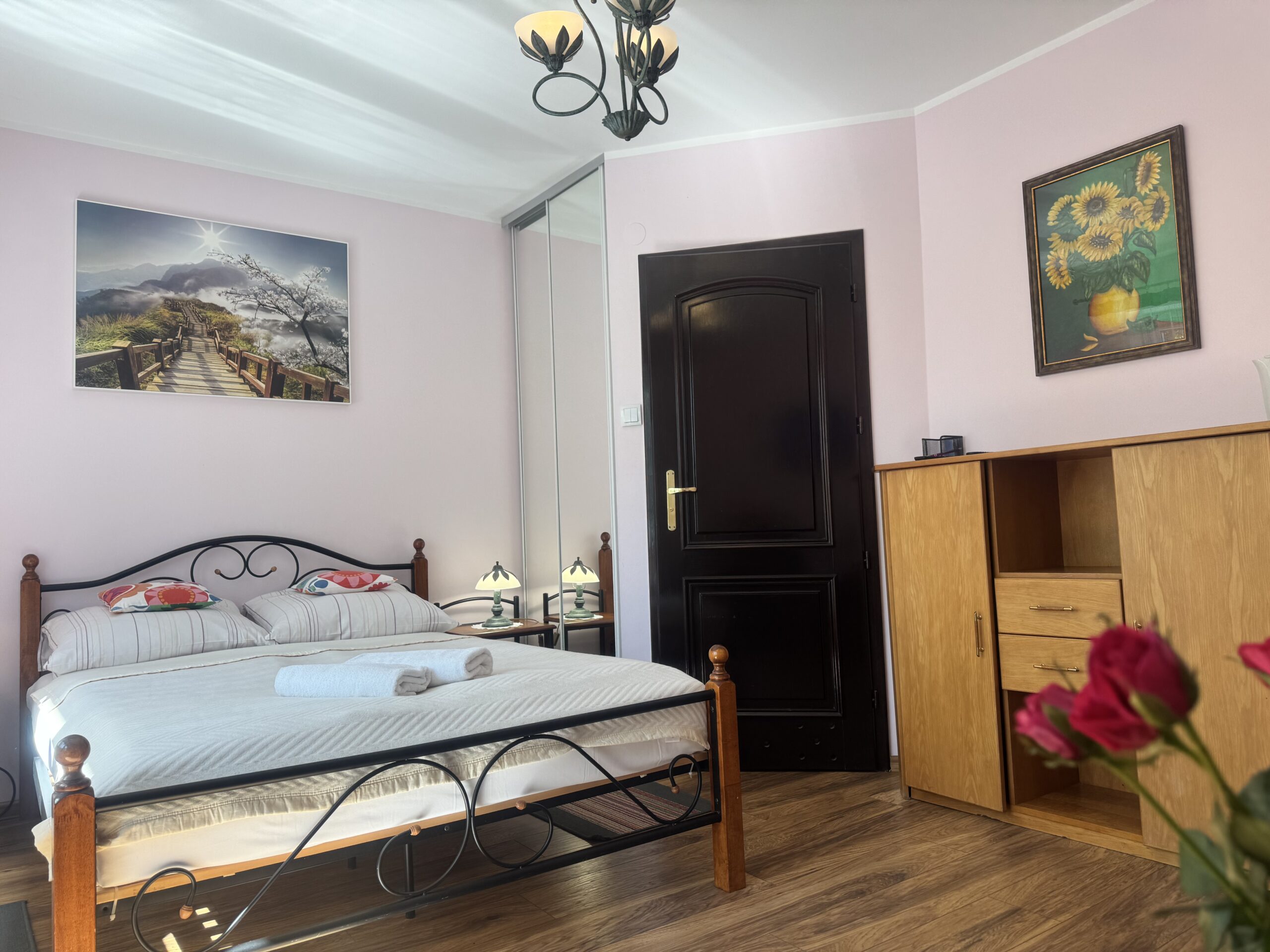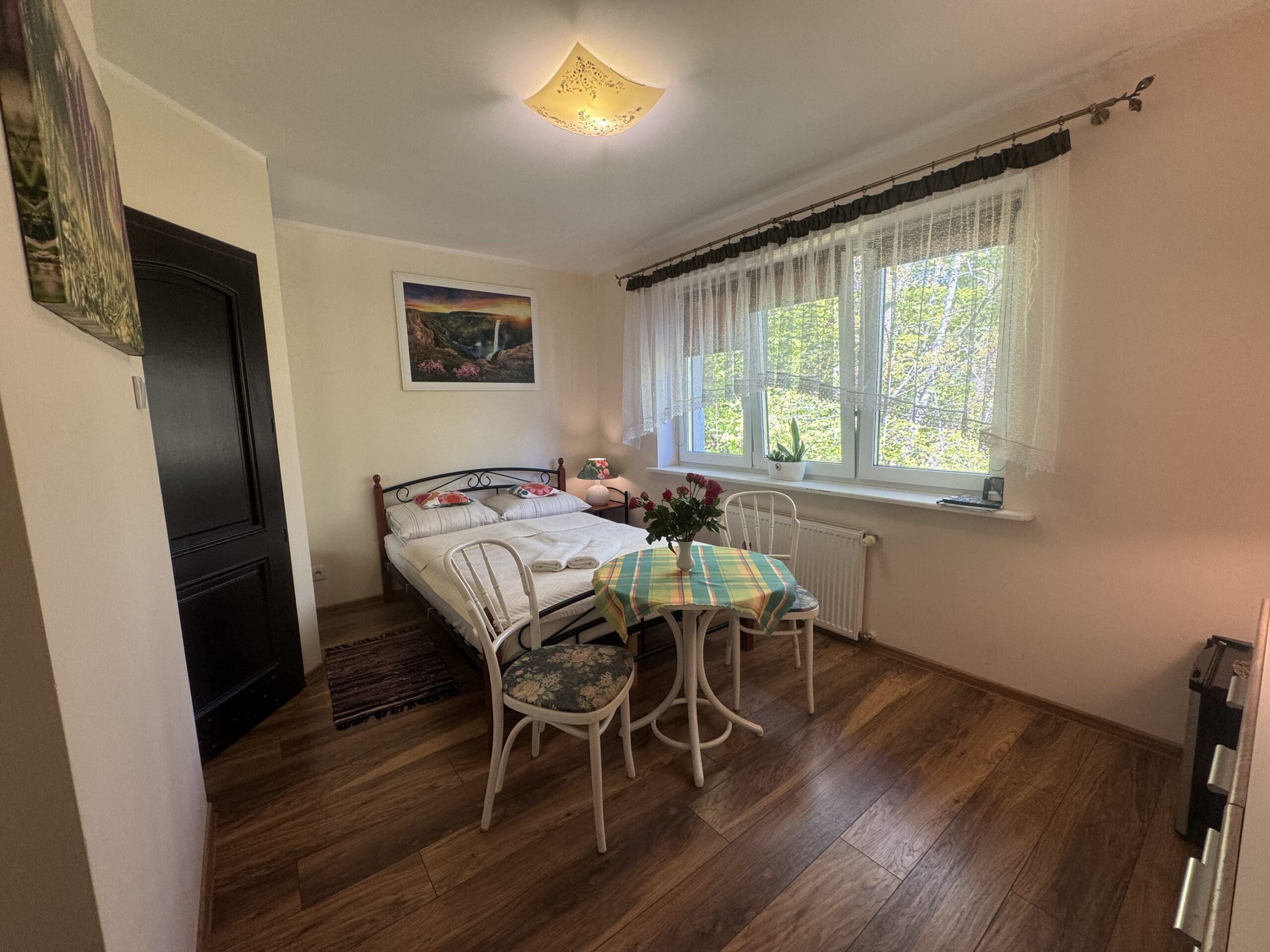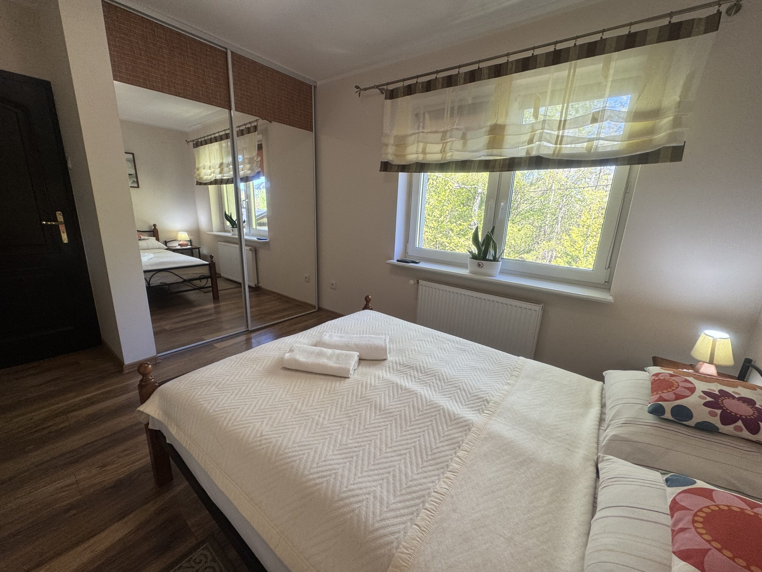 łóżko małżeńskie (double bed),stolik nocny z lampkąstolik oraz 2 krzesłakomodęszafę zabudowanąW pokoju do dyspozycji Państwa pozostają: