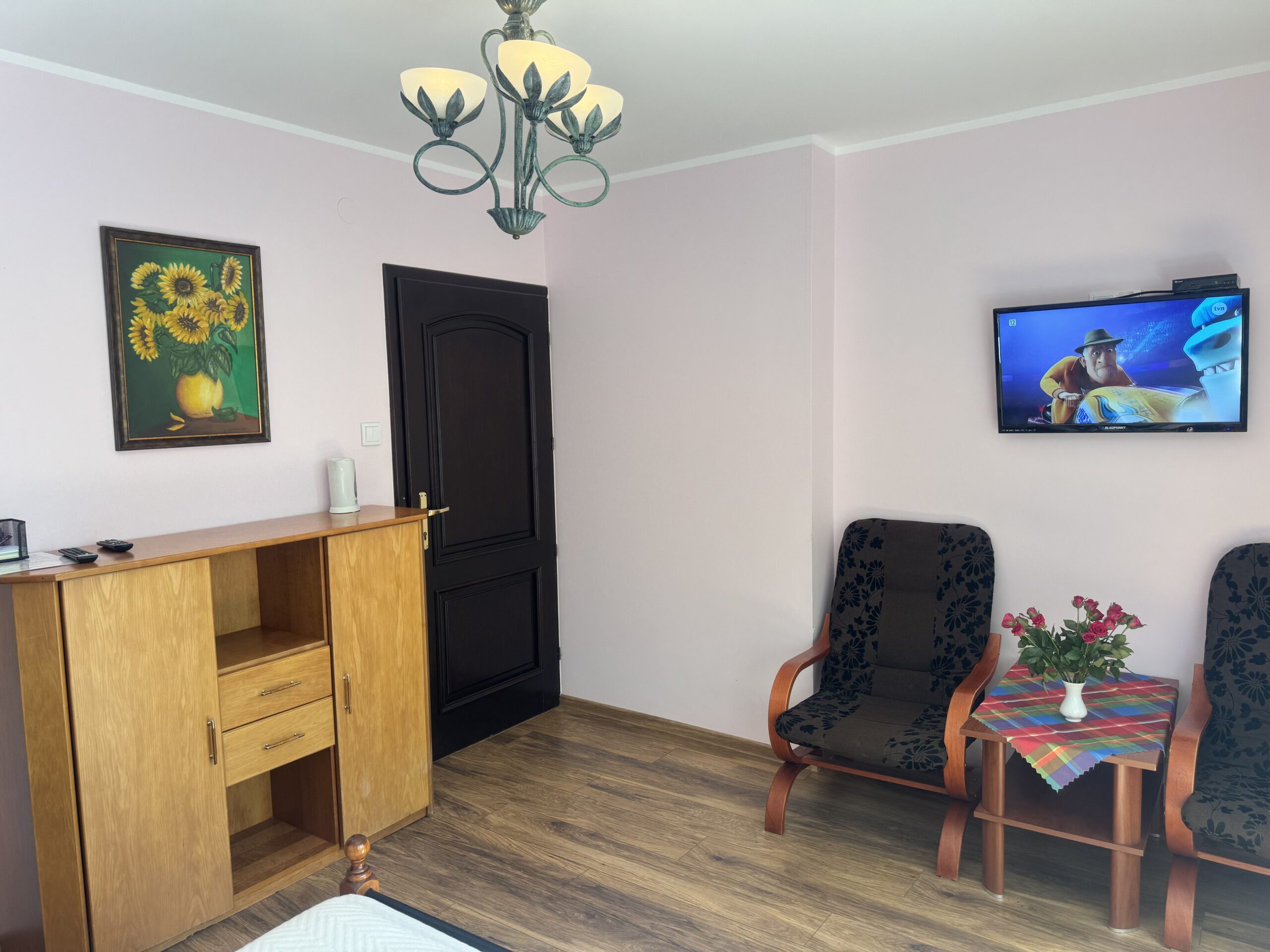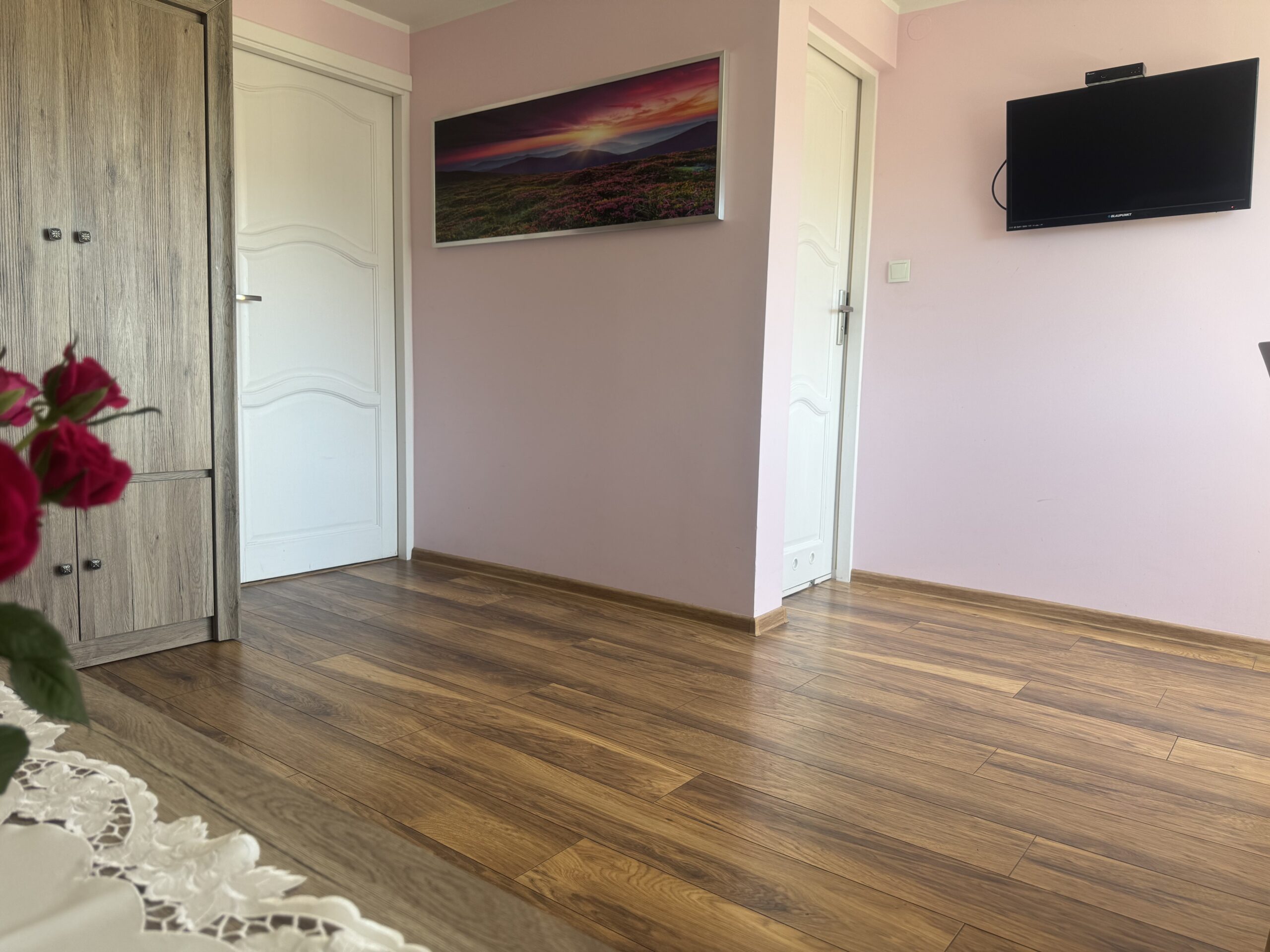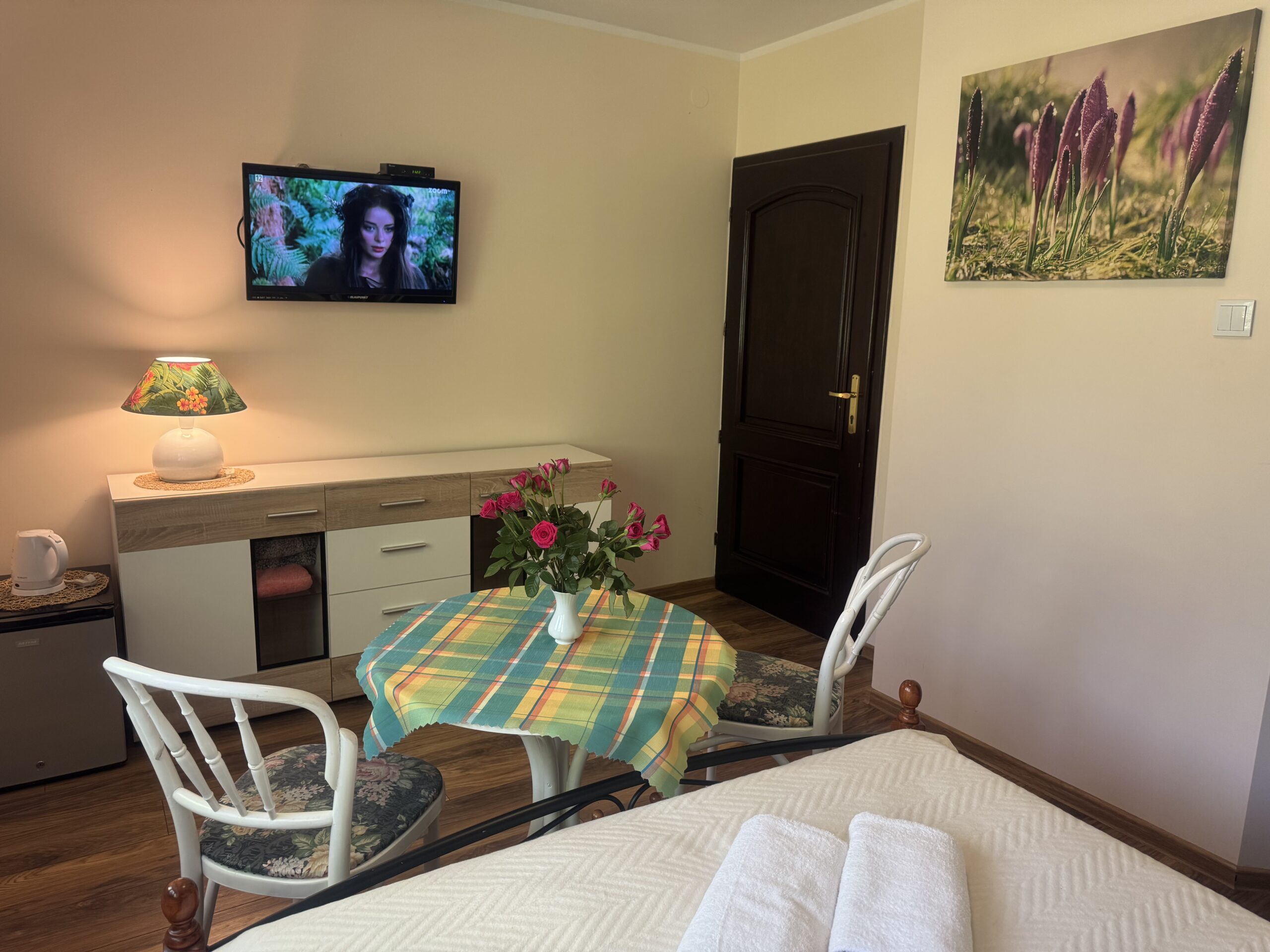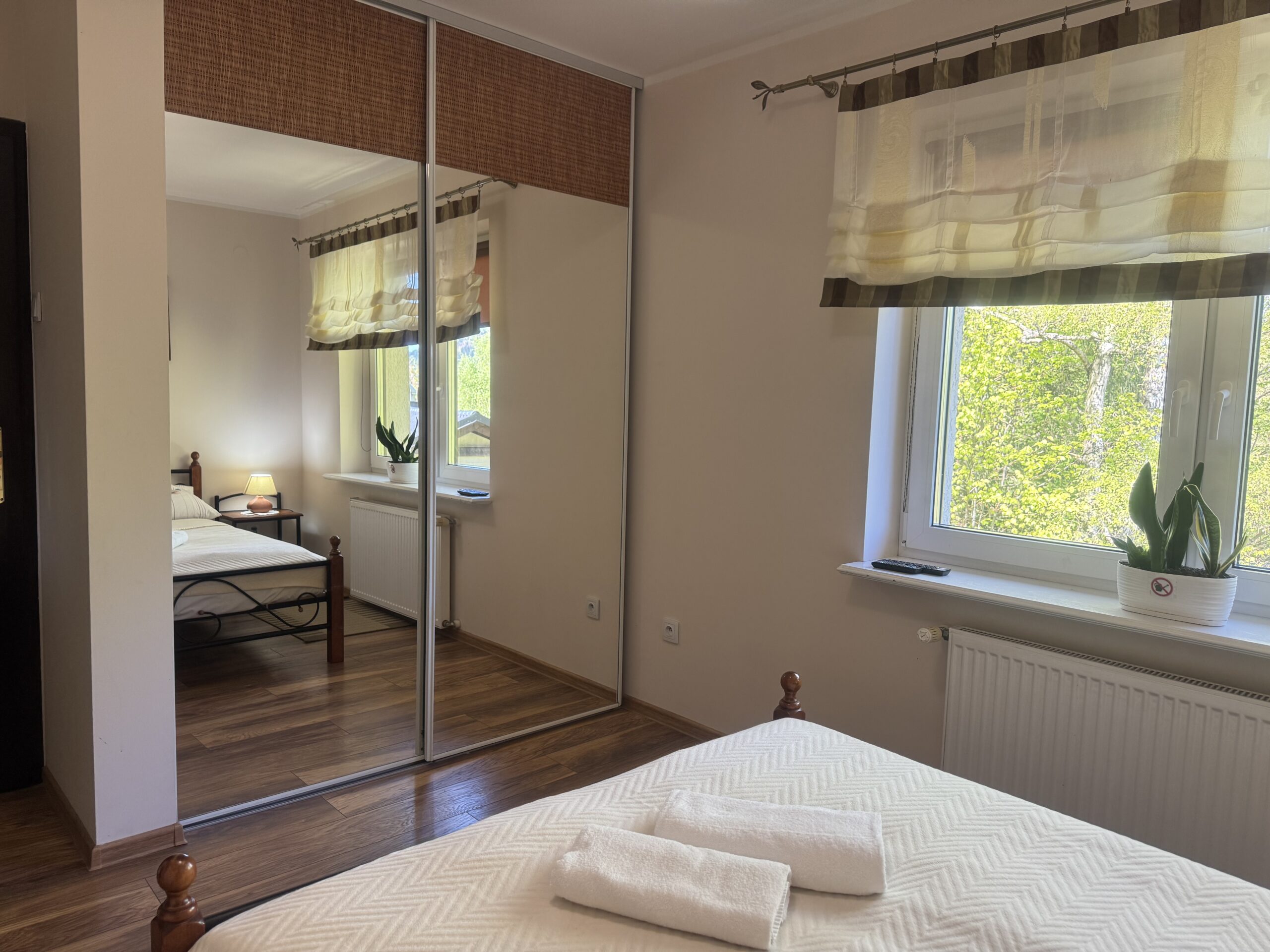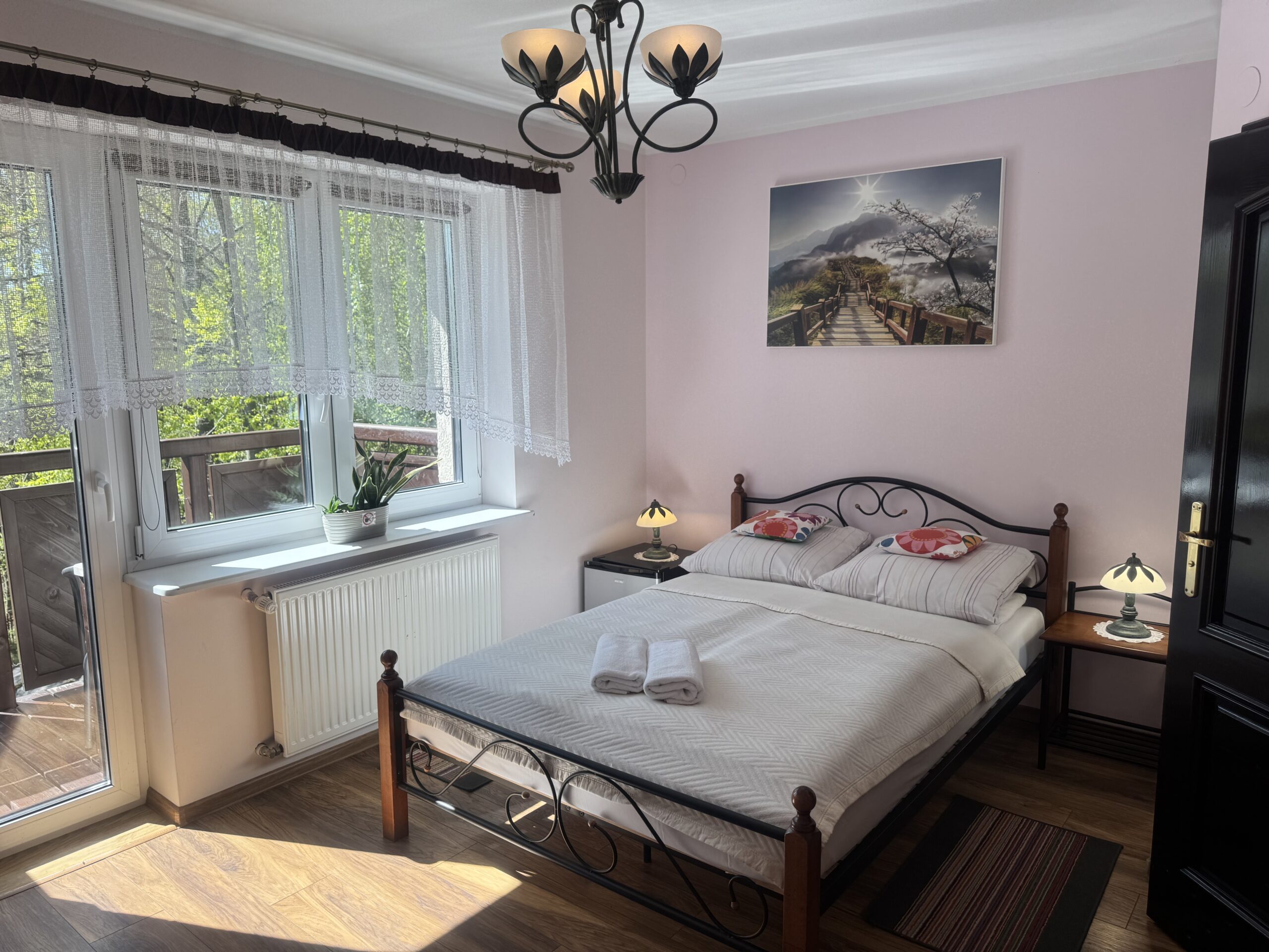 łóżko małżeńskie (double bed),stolik nocny z lampkąstolik oraz 2 krzesłakomodęszafę zabudowanąW pokoju do dyspozycji Państwa pozostają: